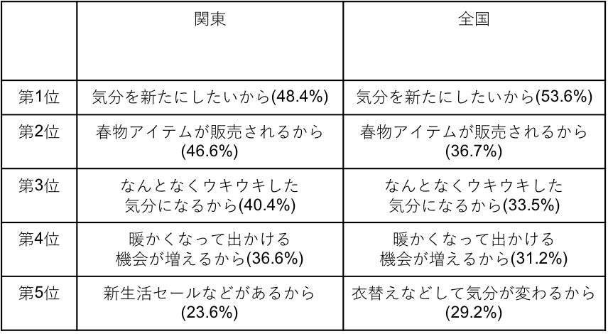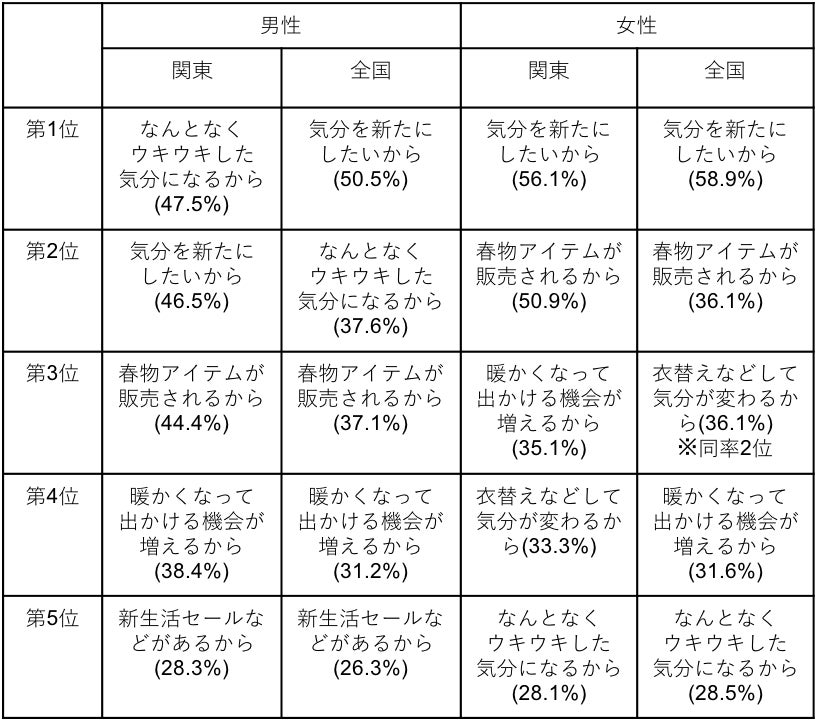 一方で、女性は関東・全国とも第2位の「春物アイテムが販売されるから(関東50.9%・全国36.1%)」及び関東第4位・全国第3位の「衣替えなどして気分が変わるから(関東33.3%・全国36.1%)」という理由が重視され、男性と比較して女性は「ファッションを中心とした春物のアイテムが買いたい」ことが動機となっている場合が多いことがよくわかる結果となりました。