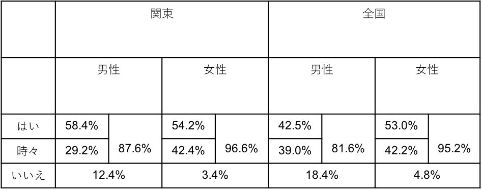 また、関東の住環境タイプ別(戸建・マンション・アパート等)に見ていくと、単身向けマンションの男性(88.5%)・ファミリー向けマンションの男性(87.0%)・ファミリー向けマンションの女性(80.0%)と戸建の女性(78.3%)で高い割合でした。