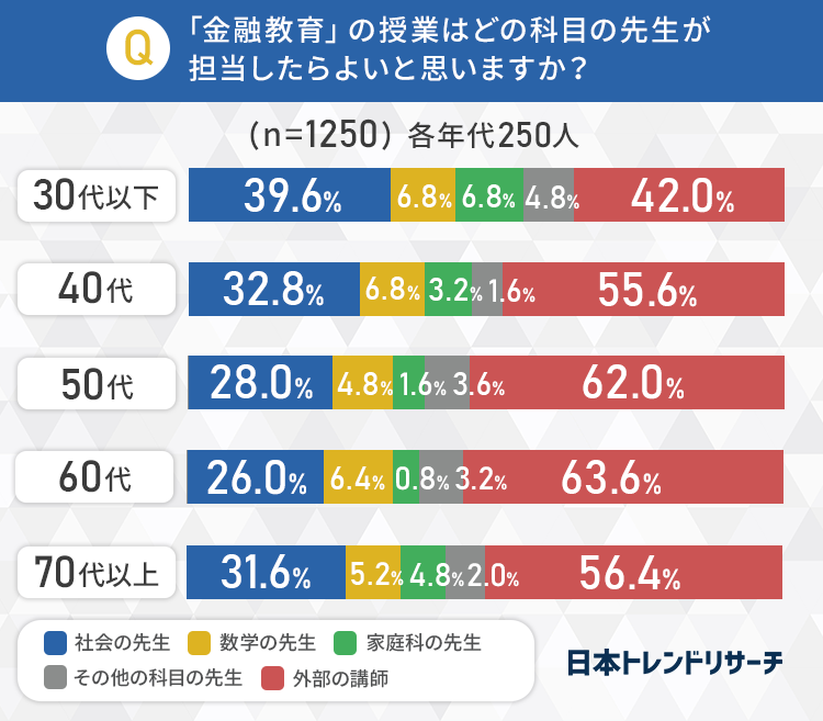 社会や数学などの要素も含む「金融教育」ですが、実際に授業を行うのは誰がよいと思うか聞きました。