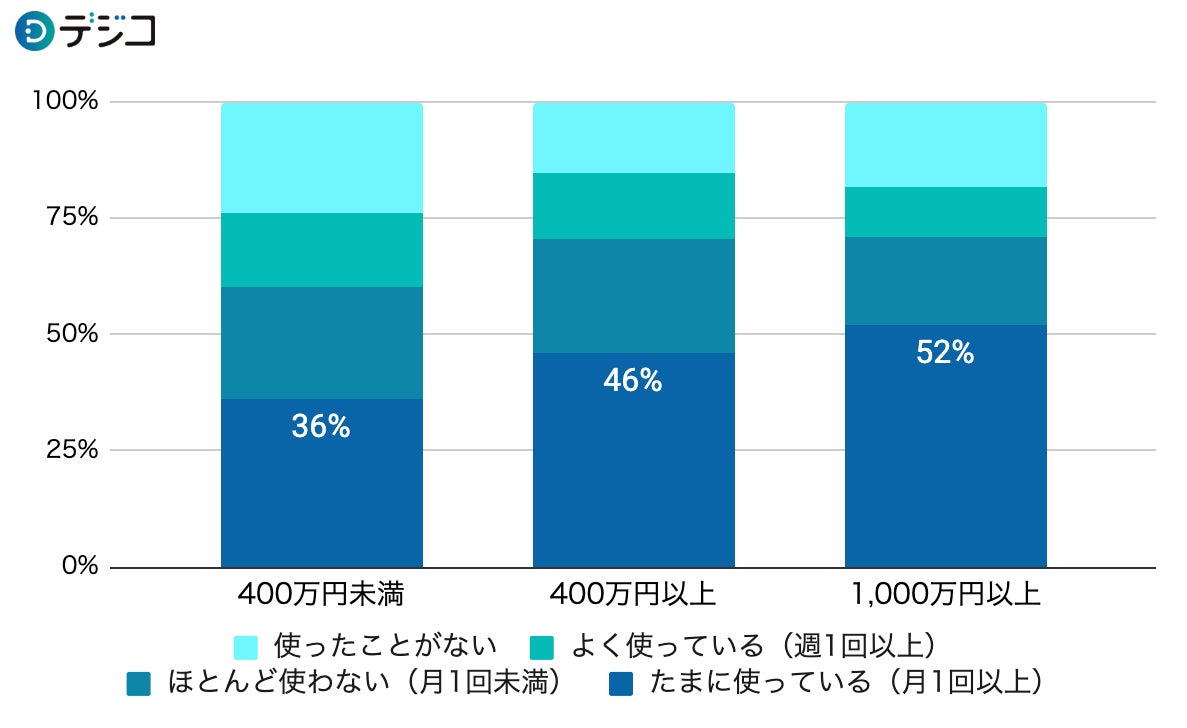 世帯年収別で比較すると、400万円未満と1000万円以上ではキャッシュレス決済を「よく使っている」と回答した割合に16ポイントの差があり、世帯年収が高いほどキャッシュレス決済を利用していることがわかりました。