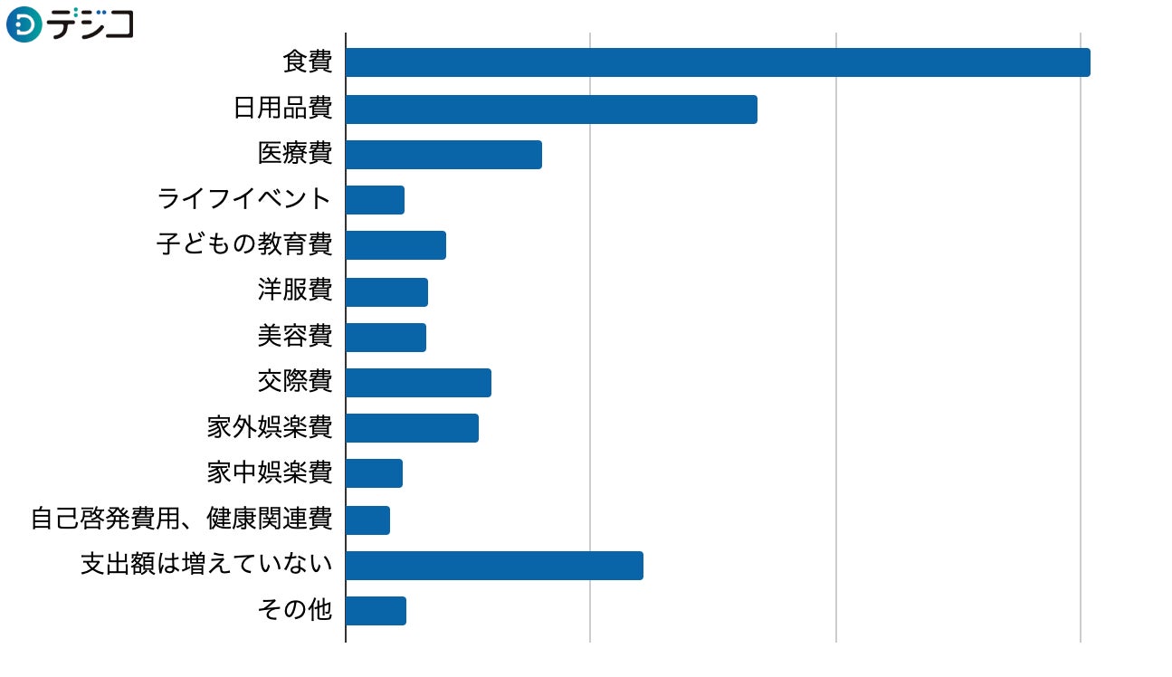 続いて、具体的にどのカテゴリで支出額を抑えて節約しているかをたずねたところ、「食費」と「日用品費」と回答した人が多く見られました。前述の支出額のうち増加したカテゴリでも「食費」と「日用品費」が多く挙げられていたことから、物価高騰などにより支出が増えてしまった分を上手く節約しようと努めている人が多いことがうかがえます。