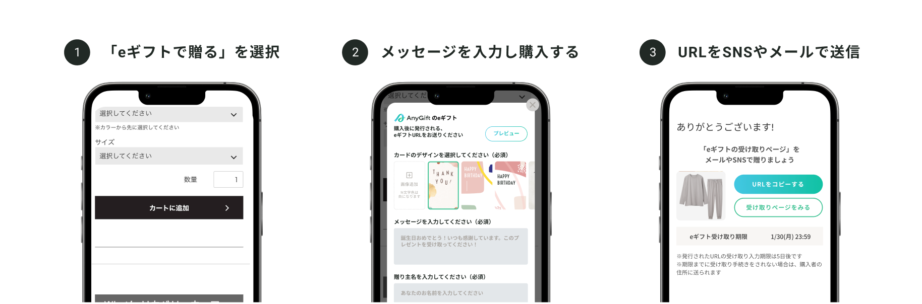 AnyGiftは、相手の住所を知らなくてもLINEやメールで贈ることができる"eギフト機能"を、ECサイトに組み込むことができるサービスです。