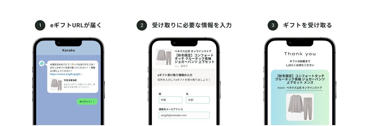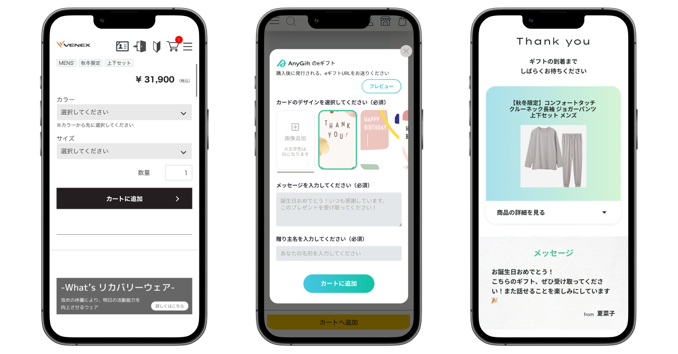 ベネクス社は、「相手の住所を確認することなく、スムーズにリカバリーウェアをプレゼントすることができる」というサービスをお客様にご提供したいと考え、この度、AnyGiftの導入が決定いたしました。