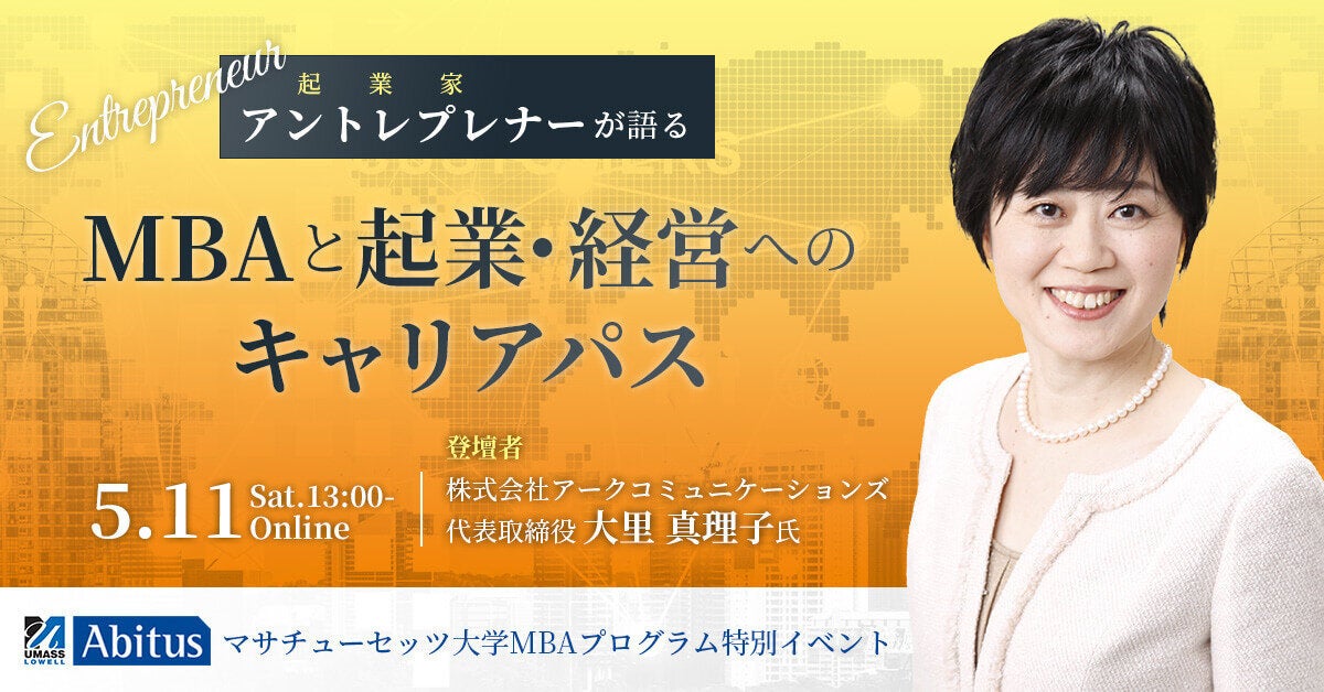 留学不要、完全オンラインで米国MBA(経営学修士)を取得できる「マサチューセッツ大学MBAプログラム」事務局は5月11日に、日本アイ・ビー・エム株式会社等でのグローバルビジネスや新規事業立上に従事した後、起業して現在も代表取締役として経営に携わっていらっしゃる大里 真理子氏をゲストに迎え、起業家、経営者としてのキャリアパスとMBAについてお話を伺うイベントを開催します。