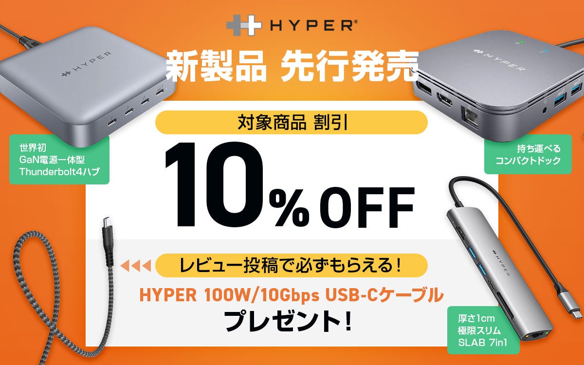 HYPER(ハイパー)は、世界初となるThunderbolt 4 ハブとGaN電源アダプタを一体化した「HyperDrive Thunderbolt 4 パワーハブ」、厚みわずか1センチのUSB-Cハブ「HyperDrive SLAB 7-in-1」、Thunderbolt 3に対応しコンパクトで持ち運びに優れた「HyperDrive Thunderbolt 3モバイルドック」の3種をHYPER Japan公式オンラインストアにて国内先行販売を開始しました。 期間中は対象商品が10%割引で購入できるほか、レビュー投稿でHYPERの100W&10Gbpsに対応したUSB-Cケーブルが必ずもらえるキャンペーンを3月上旬まで開催中です。