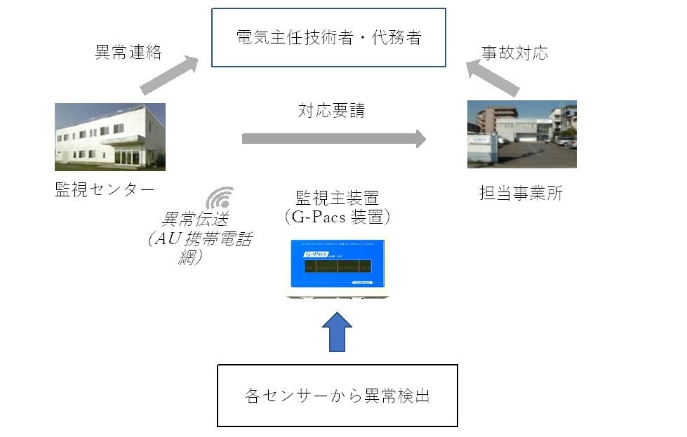 本技術は、現在の定期的な停電下での一斉点検に替えて、各種センサー類を用いて設備の状態を常時監視するものです。監視はエネサーブ株式会社の監視センターにて24時間365日行われます。異常時にはユーザーへの連絡、専門技術員を現場に派遣できる体制になっています。