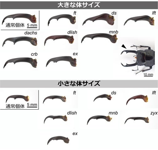 一部の動物はメスを巡るオス同士の争いなどに用いる武器として体の一部を大きく発達させます。これまで、昆虫類において武器となる器官の巨大化には翅や肢の成長に関わる仕組みの関与が示唆されていました。しかし、その仕組みにどのくらいの遺伝子群が関わるのか、また大きさだけではなく武器特有の形状の形成にも必要なのか、といったことは不明瞭でした。