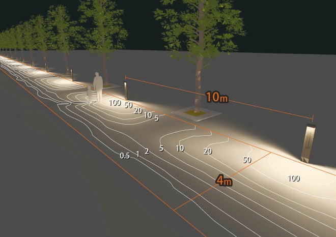 また、低位置照明のため街路樹による影の発生を抑え、歩行面の明るさを確保します。