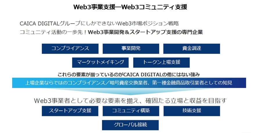 株式会社CAICA DIGITAL(本社:東京都港区、代表取締役社長:鈴木 伸、以下「当社」)はこのたび、Web3市場向けのマーケティングソリューション「Ecomedia(エコメディア)」を開発するScalably株式会社(東京都港区、代表取締役:山本 純矢、以下 スケーラブリー)と業務提携契約を締結し、Web3事業支援(Web3コミュニティ支援)を共同で展開します。本業務提携は、2022年10月期決算補足説明資料にて、グループのWeb3施策としてお示しした、Web3事業支援(Web3コミュニティ支援)の一環となります。