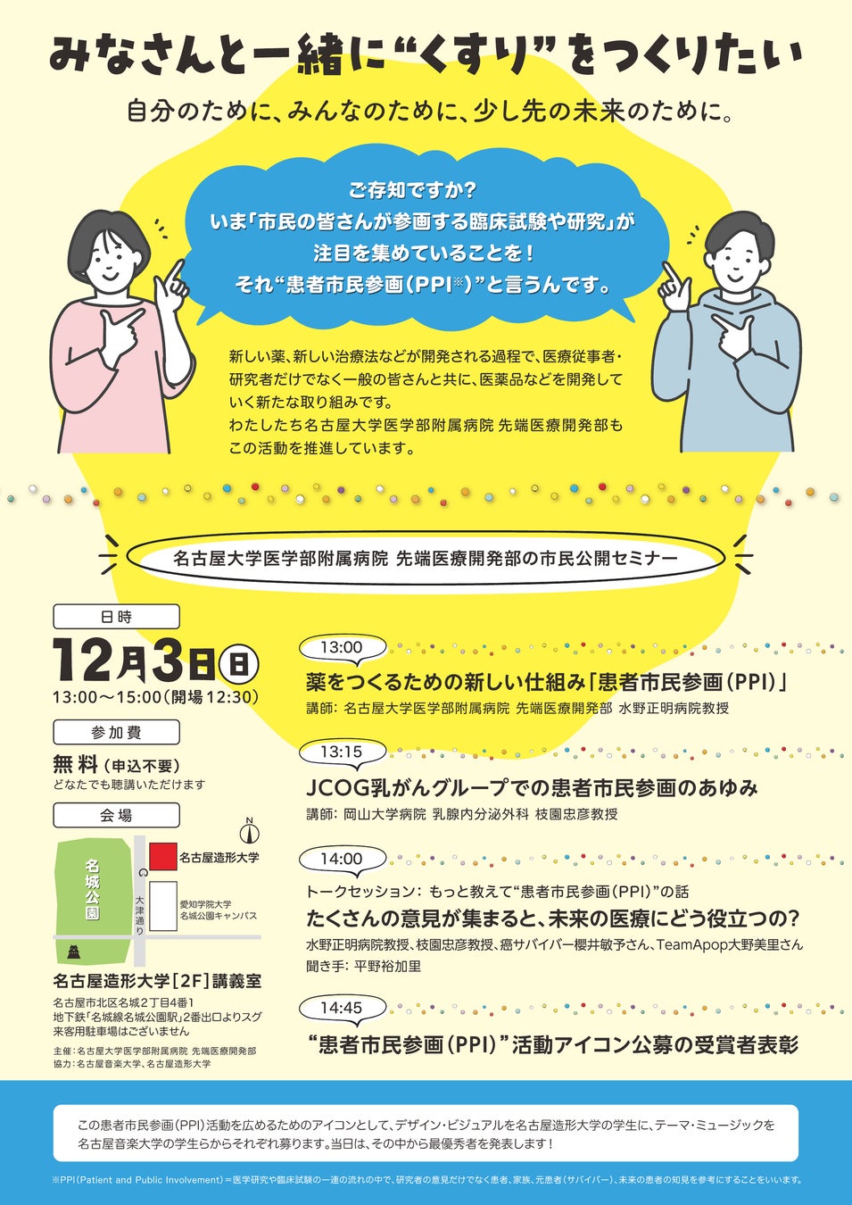 本セミナーは、名古屋大学医学部付属病院 先端医療開発部による市民公開セミナーで、PPI活動を広く知ってもらうために開催されます。