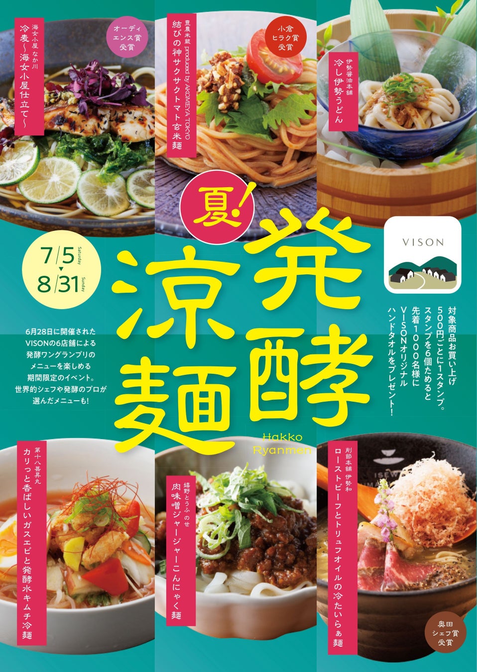 今年6月、「三重の発酵食材」と「冷やし麺」をテーマに、VISON内6店舗が自慢のメニューで腕を競うグルメコンテストを開催しました。コンテストに登場した「発酵涼麺」を期間限定で登場!身体にやさしい“発酵のチカラ”と“冷やし麺のうま味”を堪能する涼やかなひとときを、ぜひご体験ください。