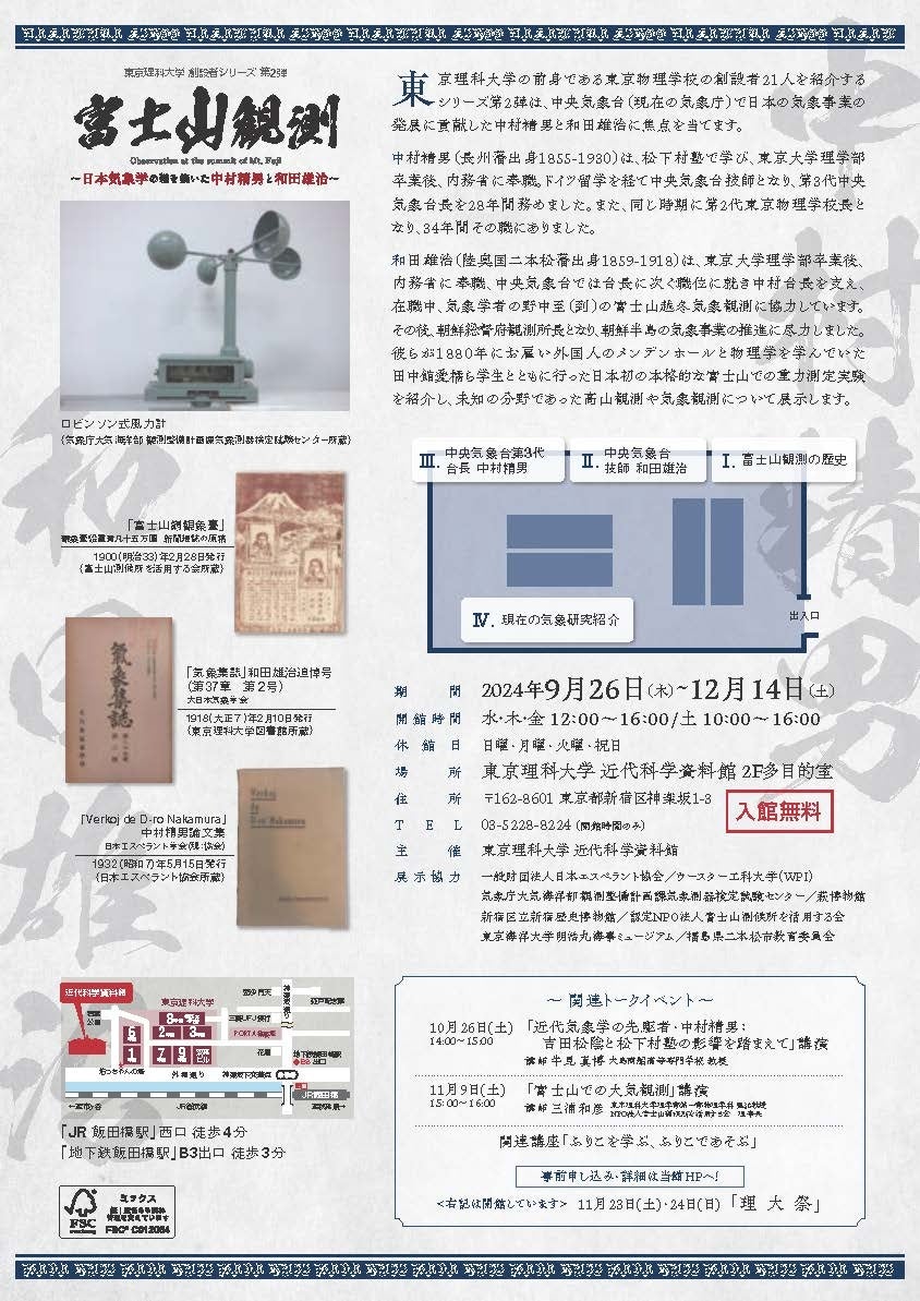 東京理科大学 創設者シリーズ第2弾 企画展「富士山観測」~日本気象学の礎を築いた中村精男と和田雄治~を開催