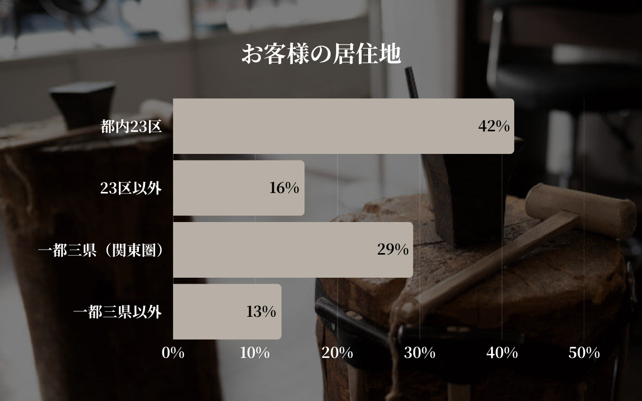 居住地別では「都内23区」が42%と最多ですが、注目すべきは「一都三県以外」の遠方からのお客様が13%と大幅に増加した点です。