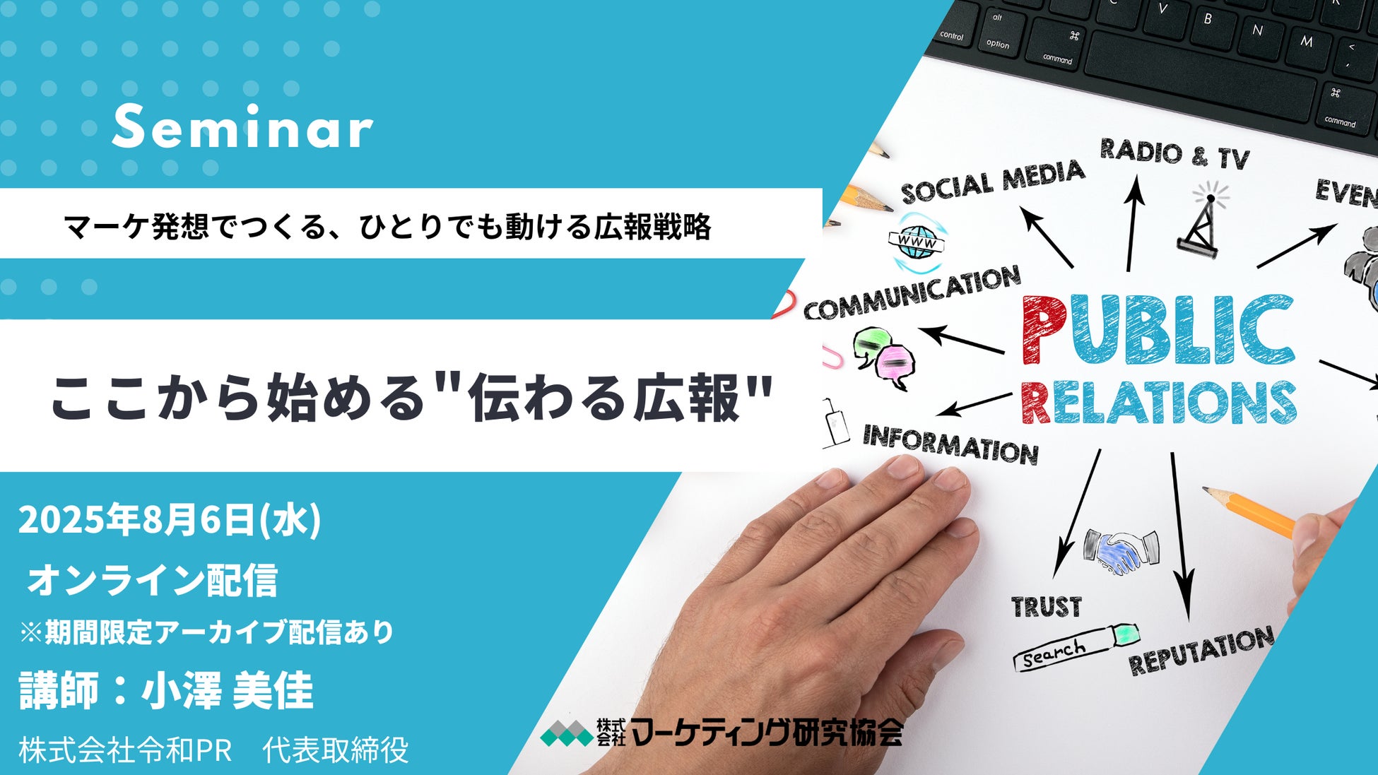 株式会社マーケティング研究協会は2025年8月6日、オンラインセミナー「ここから始める"伝わる広報"マーケ発想でつくる、ひとりでも動ける広報戦略」を開催します。期間限定アーカイブ配信あり。