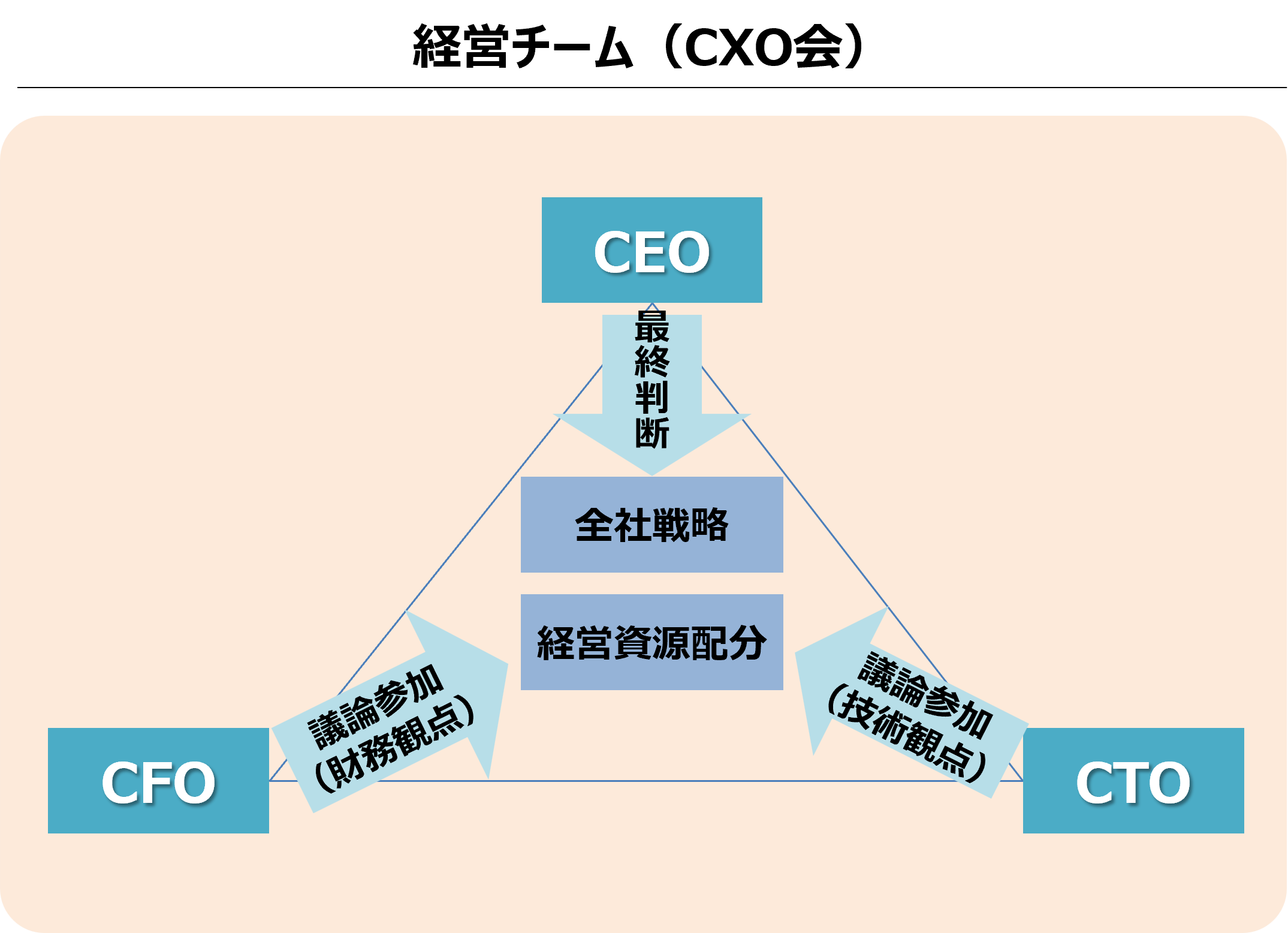 経営の重要課題に対する迅速な意思決定の実現を最優先に、CEO、CFO、CTOの3ポストに絞り込んだCXO会で高度な経営課題に対峙します。CFOおよびCTOは専任とし、CEOとともに三位一体となって経営を担います。