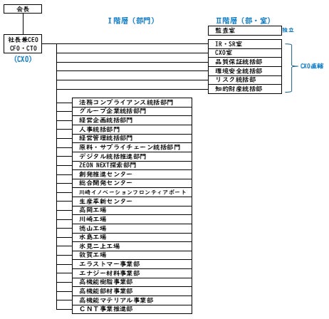 ゼオンを取り巻く環境は日々変化し、化学業界再編やゼオンの事業ポートフォリオ組み換え、中期的技術戦略、経営資源配分、地政学リスクへの対応等、より高度な経営課題への迅速な対応が求められています。 CXO制導入により、経営チーム(CXO会)がそれらの高度な経営課題に集中し、中長期的で全社最適な目線で議論を行い、迅速に判断できる体制を実現し、さらなる機動性の向上を図ります。