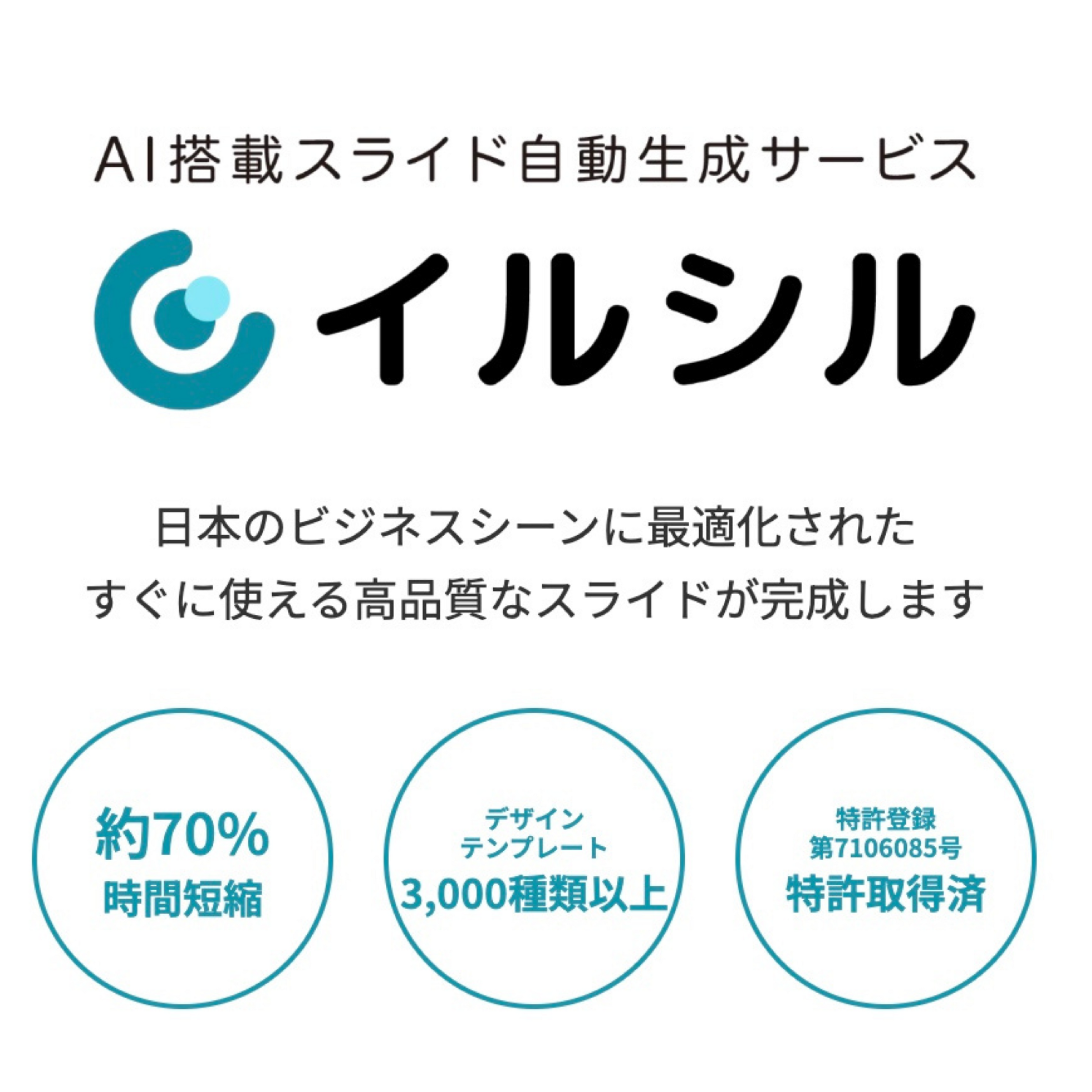 AI搭載スライド自動生成サービス「イルシル」は、生成AIでスライド資料作成を自動化し、誰でも簡単にスライドやパワポが作れるサービスです。入力したテキストからスライドを自動生成できるだけでなく、3,000種類以上のデザインテンプレートからオリジナルで作成することも可能です。