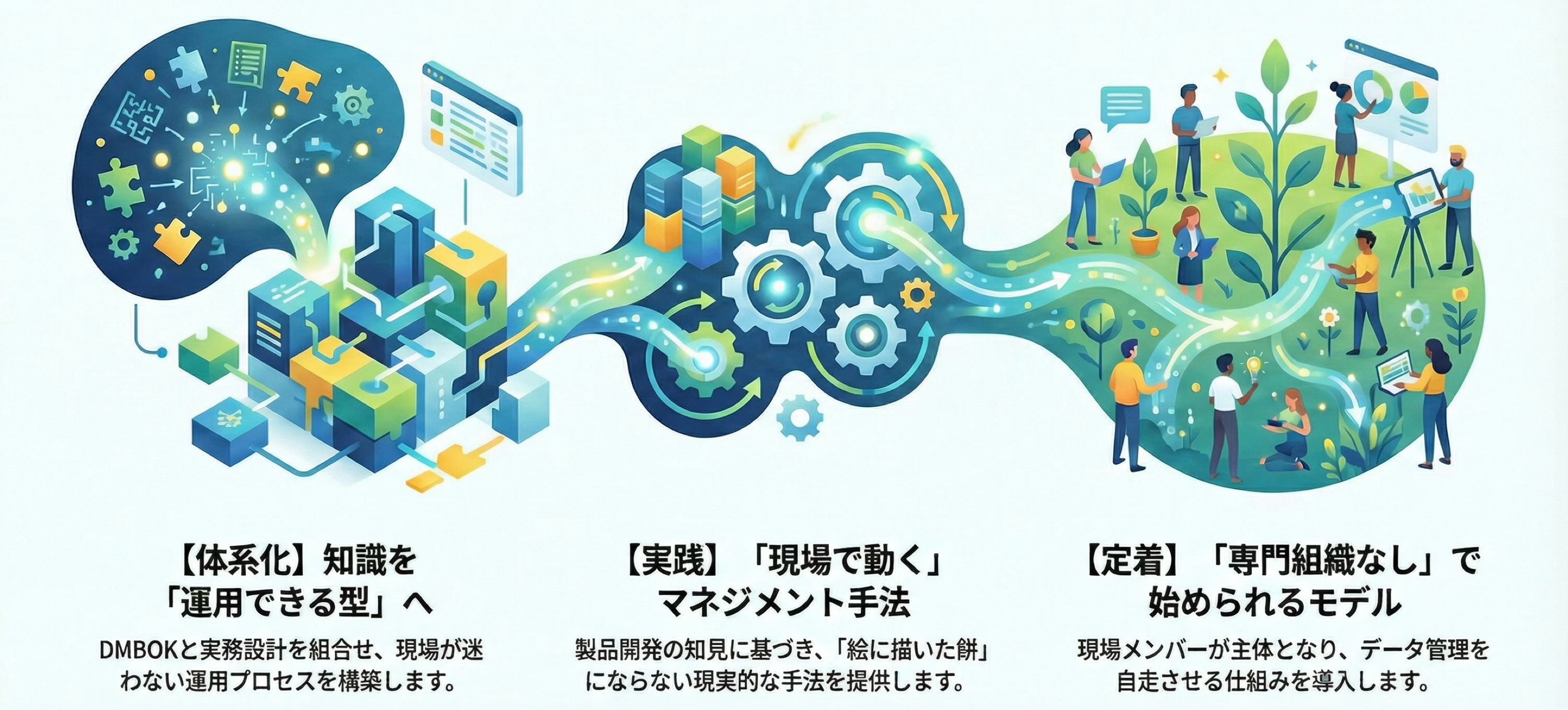 知識の習得だけに留まらず、貴社の実務に落とし込んで設計することで、現場が迷わず実行できる「DataManagementOps(運用プロセス)」へと昇華させます。