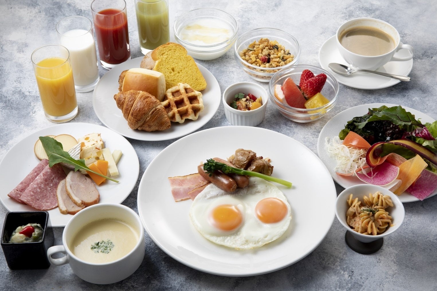 石川県産ブランド卵を使った選べるメインディッシュと、地物をふんだんに用いた和洋あわせて40種類以上の料理が楽しめるブッフェスタイルの朝食。