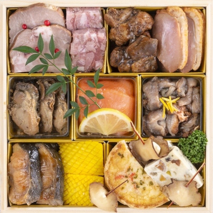 能登豚のロースト、ハムと豚足の赤紫蘇ゼリー、鶏肉の照り焼き、鴨ロース白味噌漬け、牡蠣山椒煮、スモークサーモン、能登産なまこ酢、彩り野菜甘酢漬け、銀鱈バルサミコ風味焼き、いか黄金焼き、蟹のキッシュ、ドライフルーツのテリーヌ、いぶりがっこチーズ串