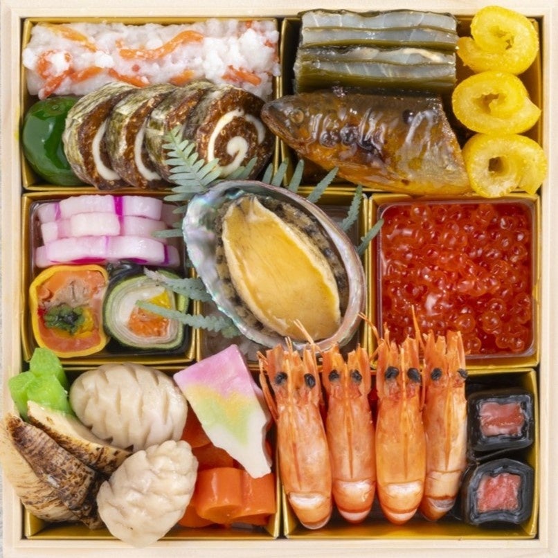 かぶら寿司、青梅甘露煮、ともえ柿ロール、かじき昆布〆、子持ち鮎、網笠柚子、花れんこん、サーモンマリネ錦糸巻き、のどぐろ青菜巻き、紅白なます、蒸し鮑、いくら醤油漬け、煮物(羽子板麩・梅人参・海老芋松笠・竹の子・蕗)、焼き海老、鮭昆布巻き