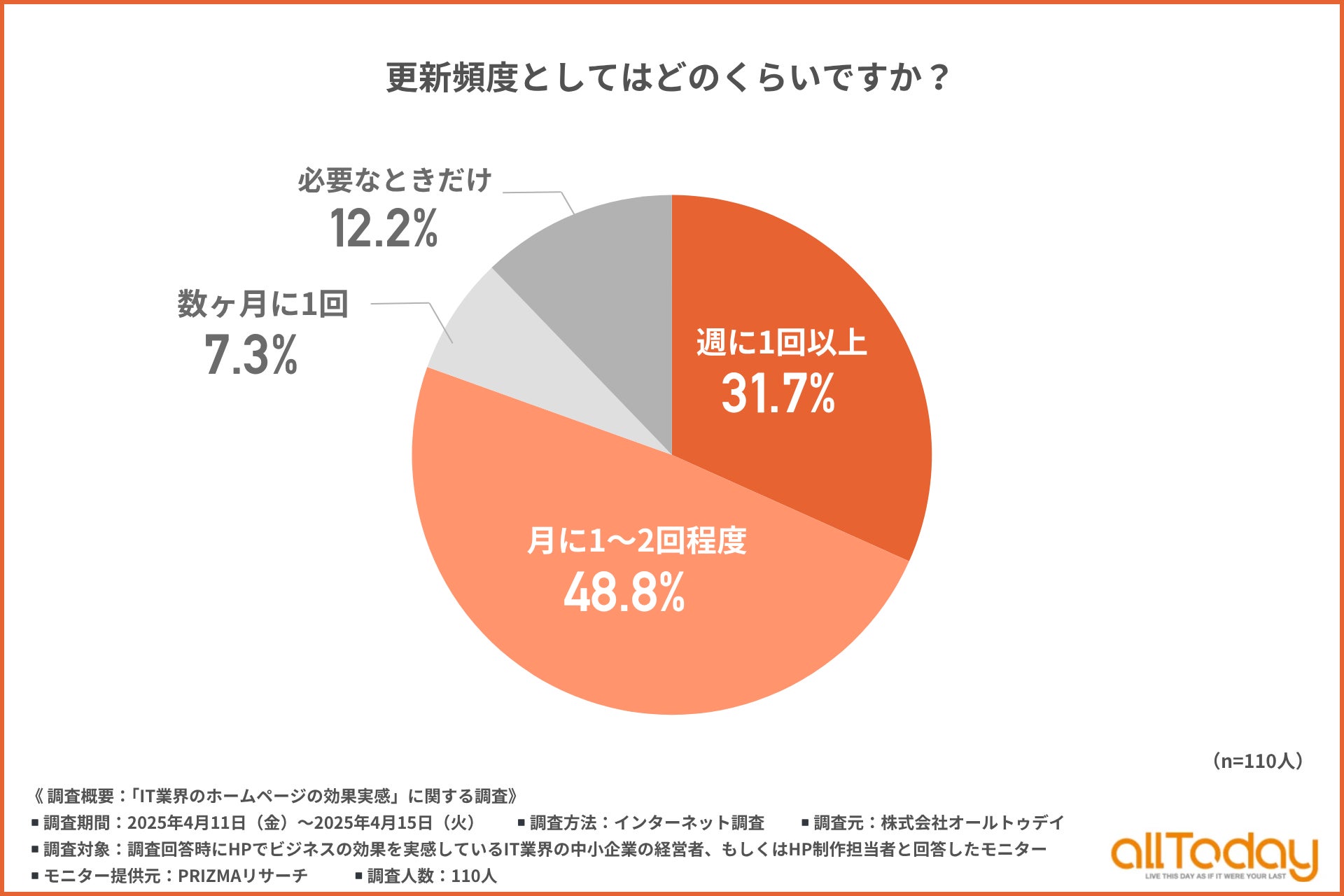更新頻度については、「月に1〜2回程度」が最多となりましたが、「週に1回以上」の高頻度更新を行う企業も3割超となり、ホームページを営業活動の一環として積極的に活用している企業の姿が見て取れました。
