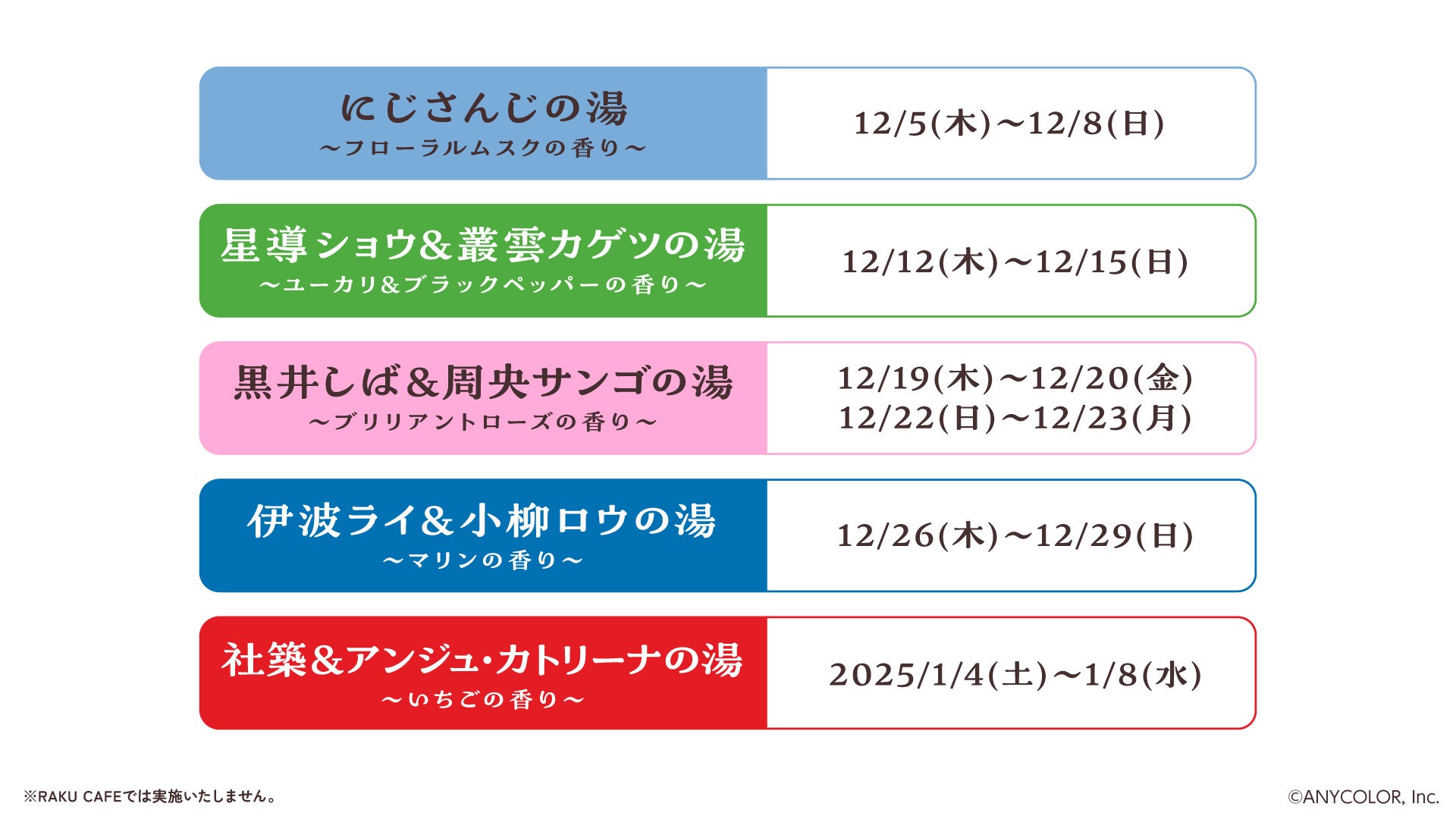 にじさんじをイメージした5種類のコラボ風呂が登場します。