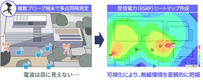 ローカル5G運用パフォーマンスモニタは、ローカル5Gの電波環境を可視化するモニタリングソリューションです。エリア内の複数のプローブ端末で多点同時測定を行うことで、時間変動も考慮した電波環境が把握できるため、通信トラブルからの迅速な復旧や通信障害の未然防止など、ネットワークの安定運用に貢献します。