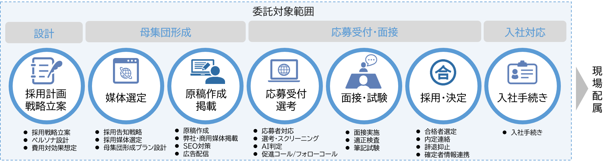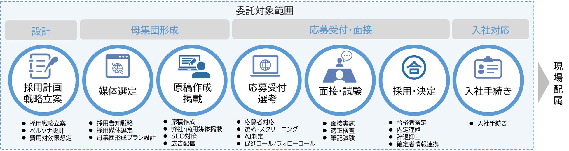 本サービスは、2023年4月より当社内の業務で運用しているAI予測モデル「業務マッチング型採用モデル※1」を活用したAIによるヒトと業務との最適なマッチングのほか、採用専門人材によるコンサルティング役務の提供に基づく、採用戦略の立案から、計画設定、選考、入社手続きといった採用プロセスを一気通貫で担うものです。