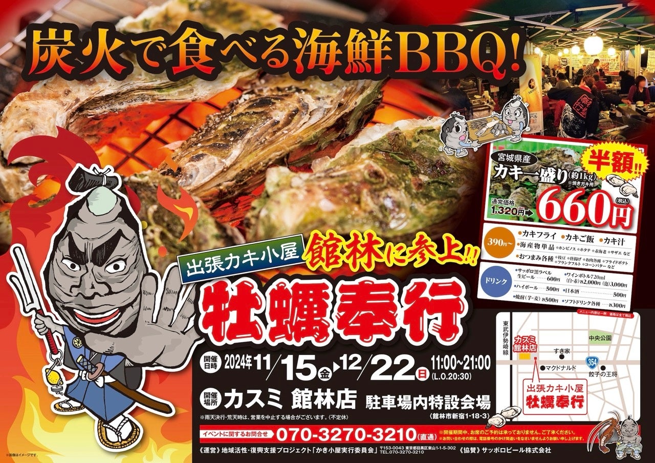群馬県館林市 ▶︎東北の牡蠣が、復興支援価格の約1kg660円!! 11/15 - 12/22 の限定出店!炭火焼き出張カキ小屋「牡蠣奉行」