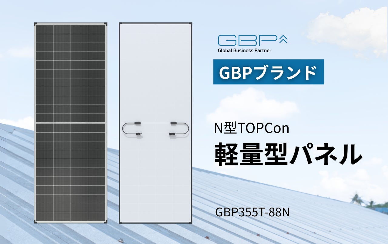 再生可能エネルギー、EV自動車部品、AI及びIoT領域における先進技術を駆使し、グローバルに急速に成長している、~再エネ業界の風雲児~ GBP株式会社(本社:東京、以下GBP)は、自社ブランドのN型TOPCon軽量型パネル「GBP355T-88N」を発売します。超軽量(5.6kg/㎡)、高い発電効率(21.3%)、高い剛性を備えた本製品は、耐荷重性の低い屋根への設置に最適です。これまで太陽光発電の導入を断念していた築年数の古い建物や、建築基準を満たさない建物にも、新たな可能性をもたらします。