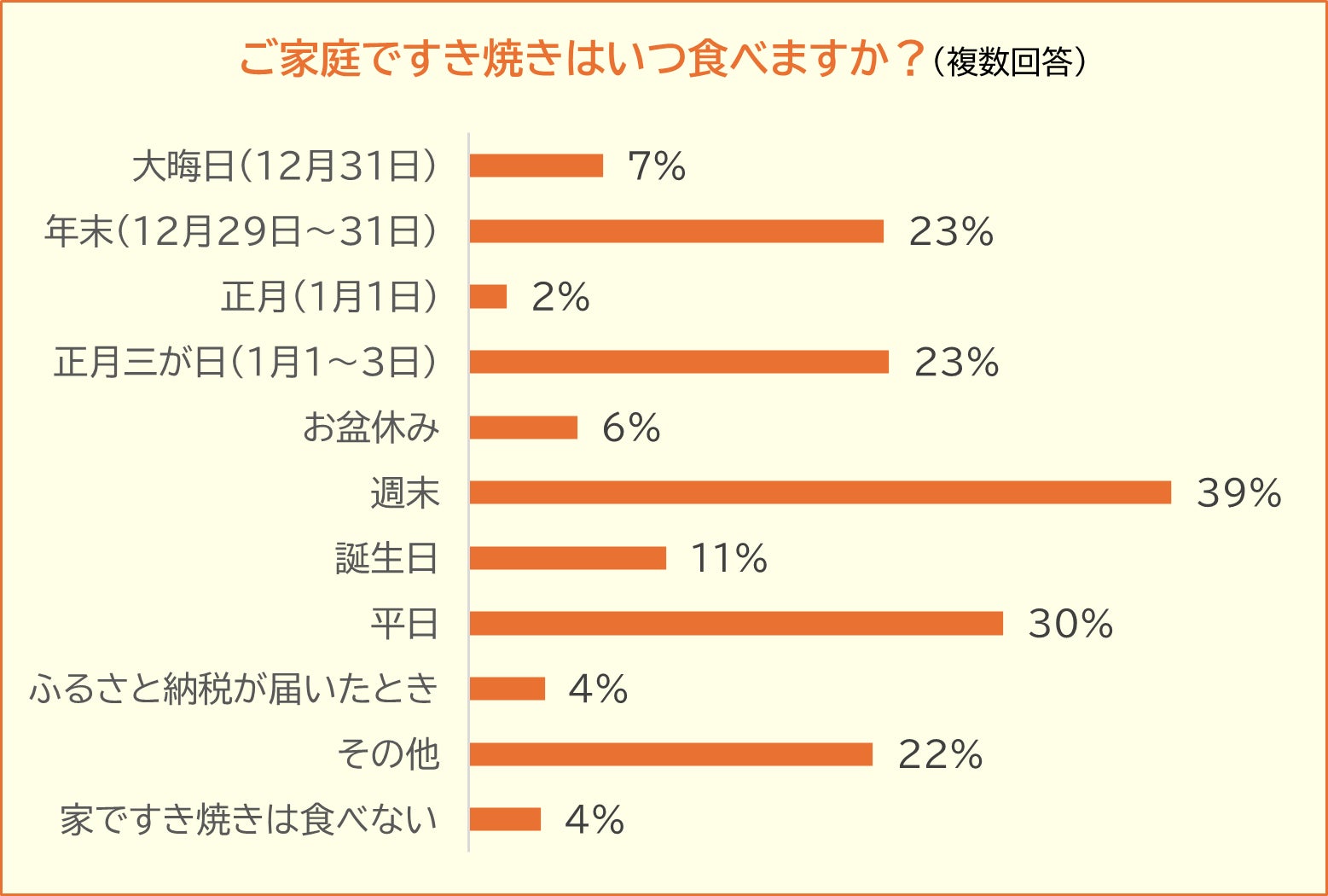 ご家庭ですき焼きを食べるタイミングは、「大晦日」「年末」「正月」「正月三が日」のいずれかを選択した人が延べ約55%でした。「週末」と回答した人は約39%、「平日」と回答した人は約30%で、年末年始だけでなく、普段から食べられていることがわかりました。