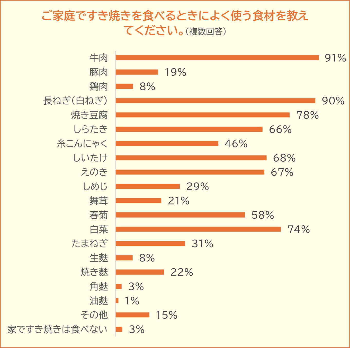牛肉、長ねぎ、焼き豆腐、しらたき、しいたけ、えのき、春菊、白菜を選択した人が50%を超えました。すき焼きの定番食材と言えそうです。