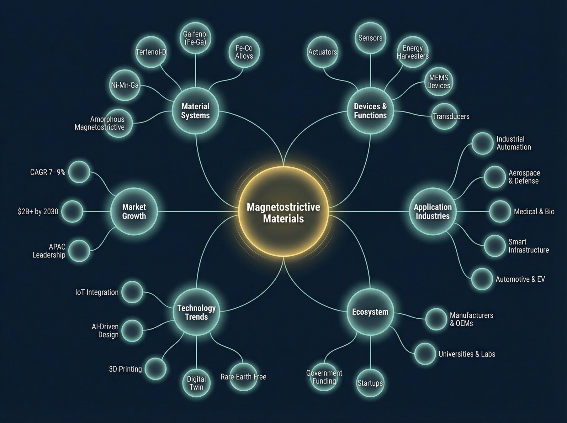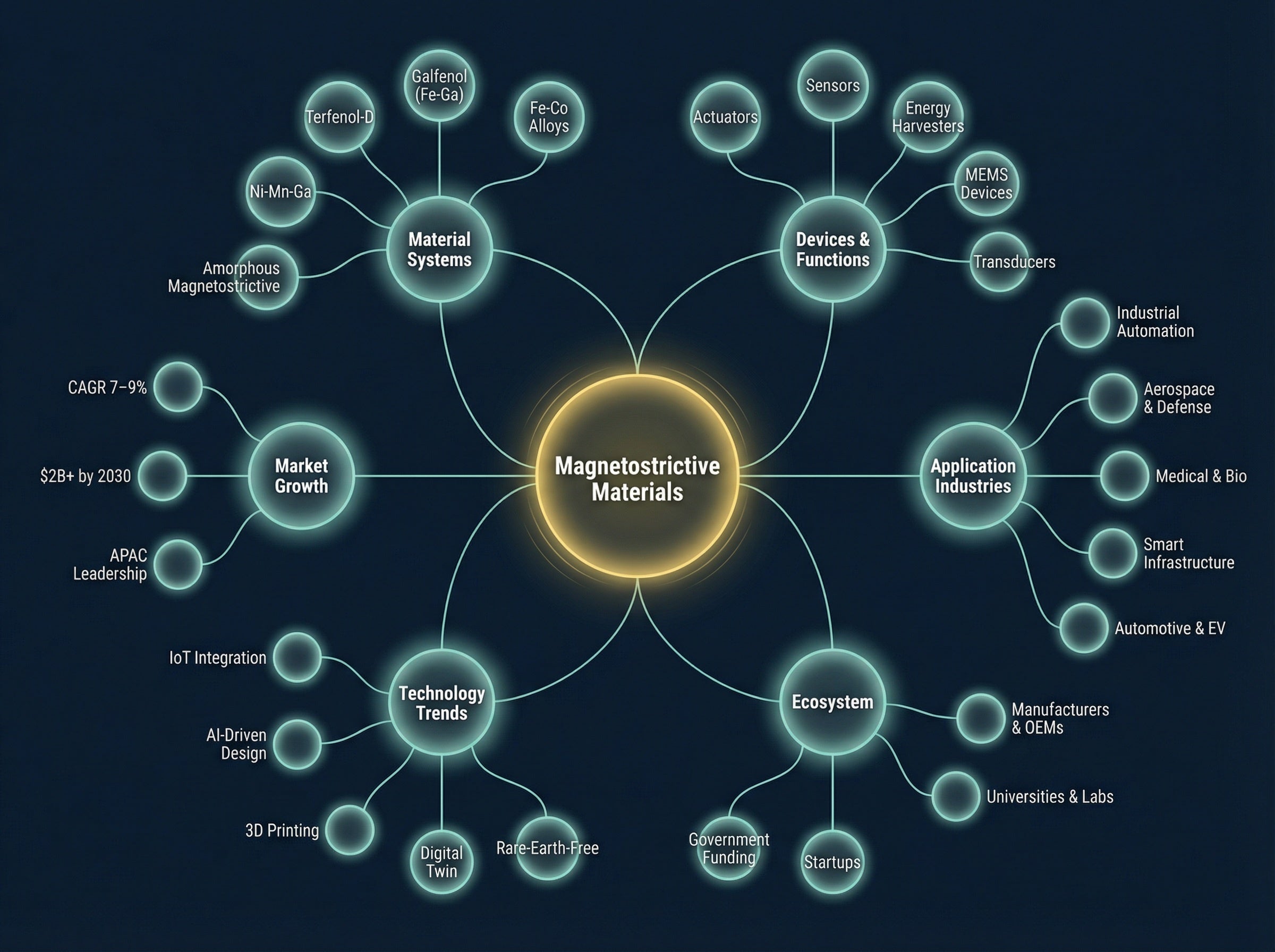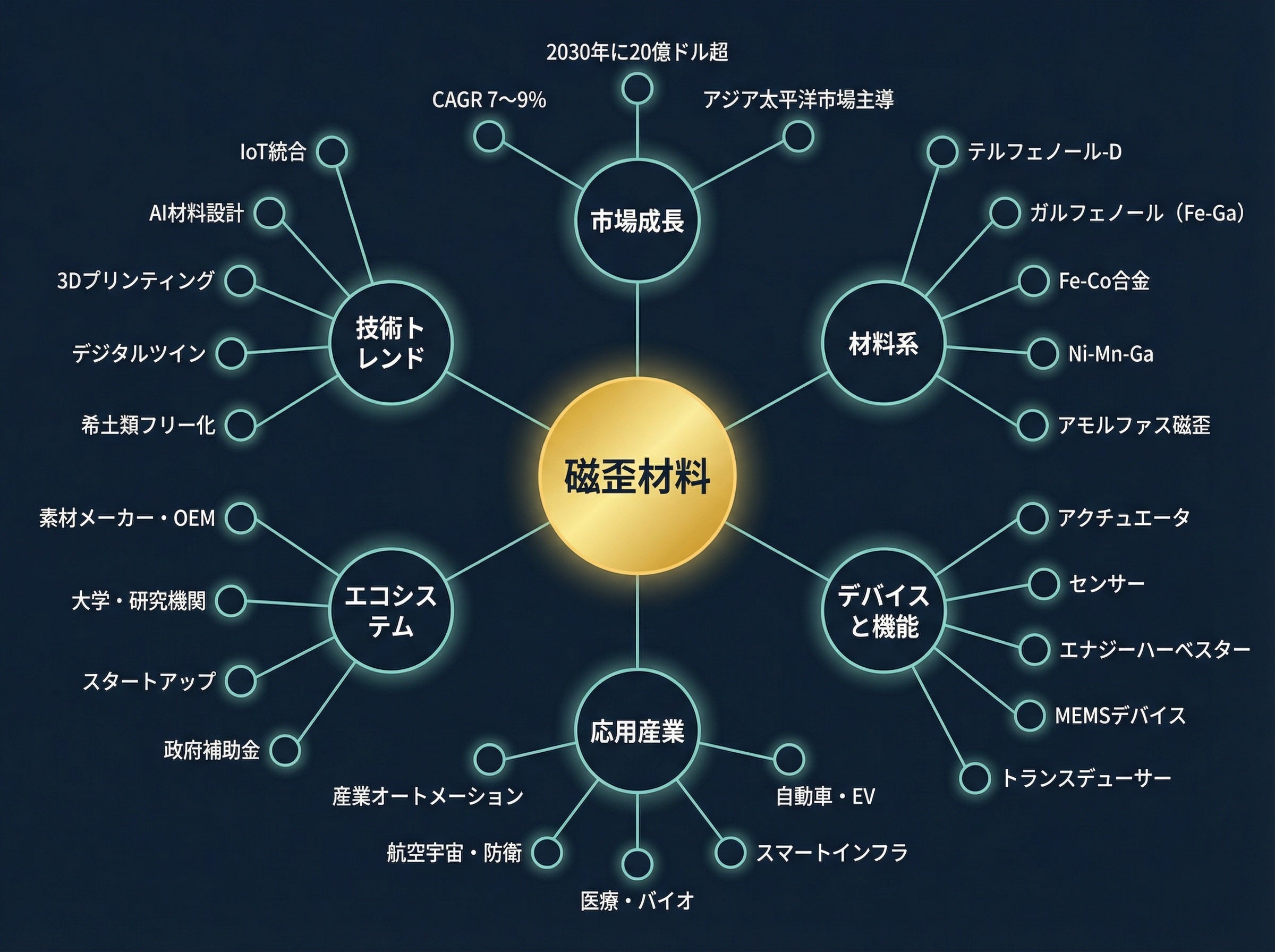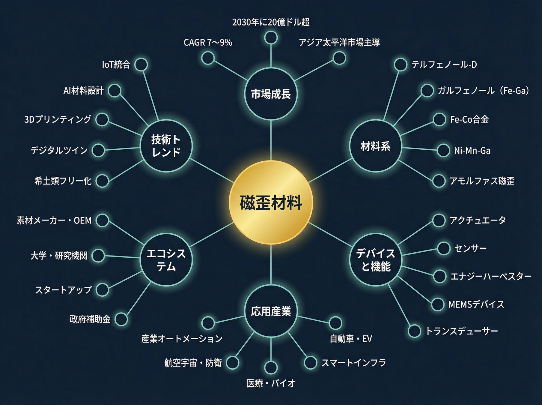 AI/シミュレーションを活用した組成・構造最適化と、3Dプリンティングによるニアネットシェイプ製造を組み合わせる。量産コストダウンと高機能化の両立が、磁歪材料の用途拡大を最大化する鍵である。