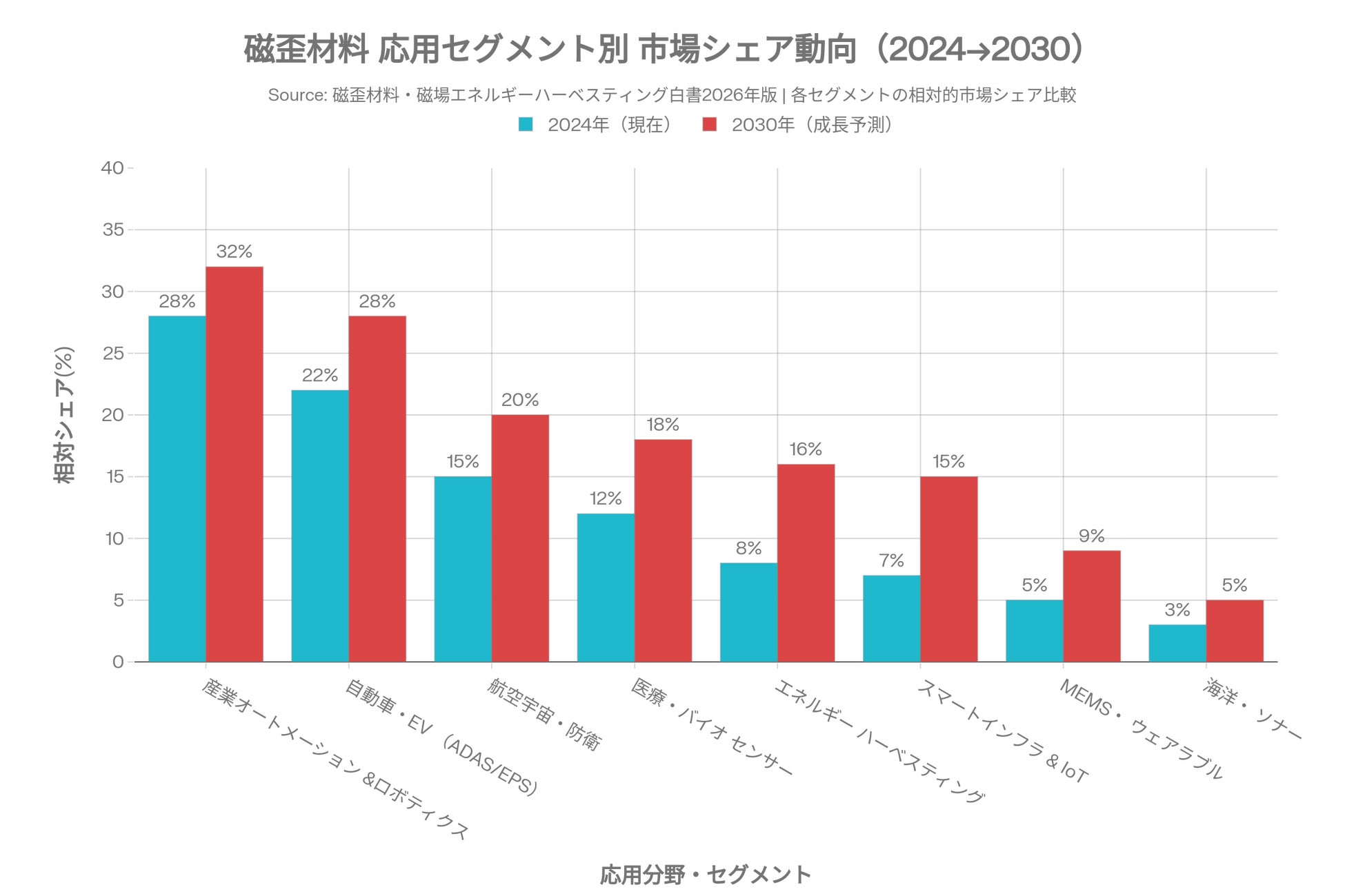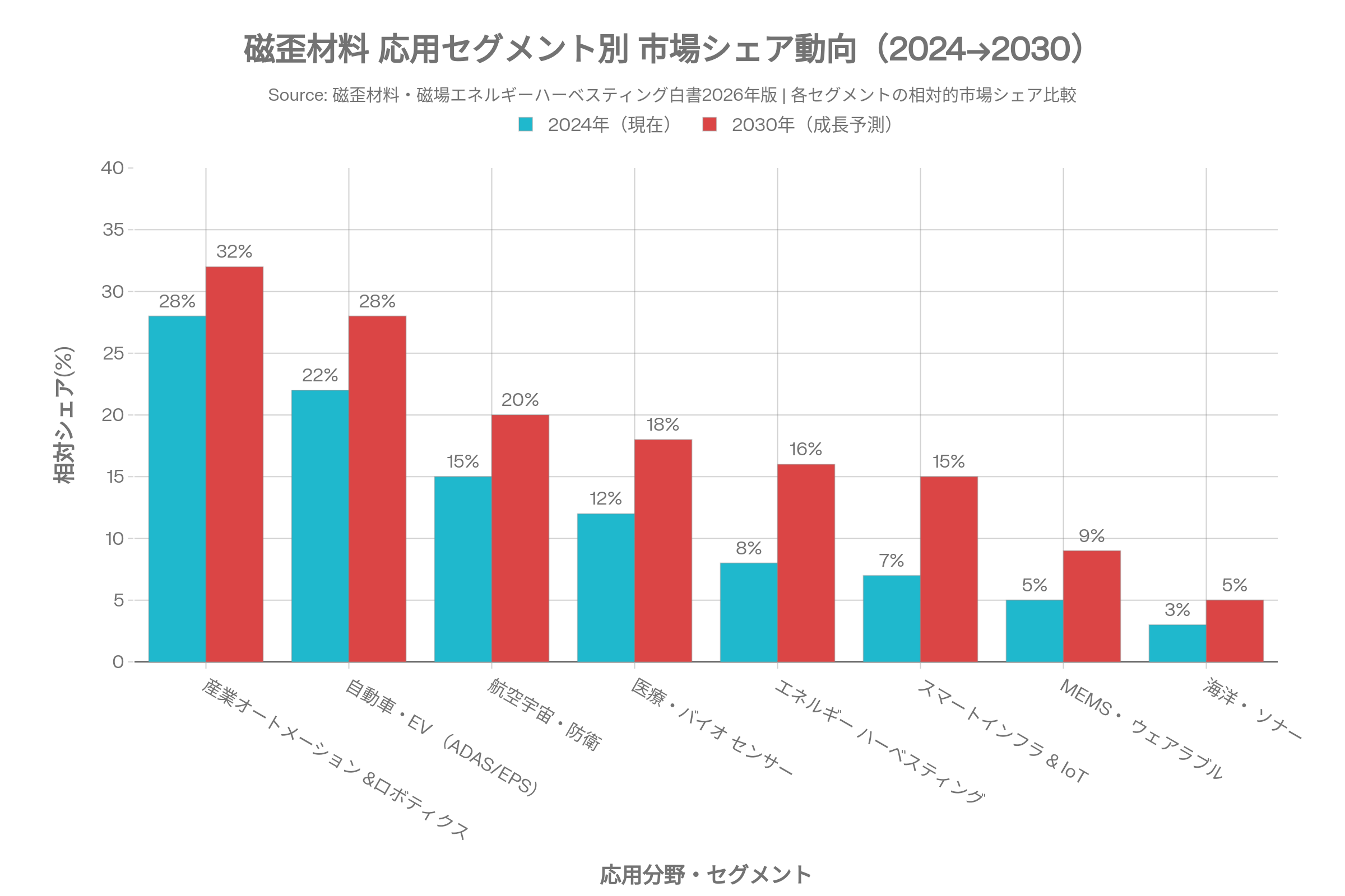 本白書は、磁歪材料(Magnetostrictive Materials)および磁気伸縮性材料の全領域を網羅した、2026年版の最新産業白書である。磁界・振動・機械力エネルギーを相互変換する「スマートマテリアル」として、磁歪材料は現在、産業オートメーション・自動車・航空宇宙・医療・スマートインフラという五大産業領域で同時多発的に採用が加速している。