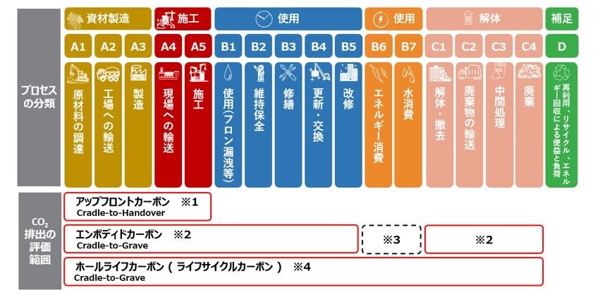 ※2 アップフロントカーボンに、その後の修繕や解体・廃棄まで、全ての工事に伴い発生するCO2排出量を加えたもの