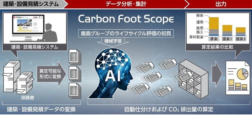 鹿島(社長:天野裕正)は、AIを活用して建物のライフサイクル全体のCO2排出量を正確に算定するシステム「Carbon Foot Scope(TM)」(カーボンフットスコープ)を、株式会社ゴーレム(代表取締役CEO:野村大輔、本社:東京都千代田区)と共同開発しました。