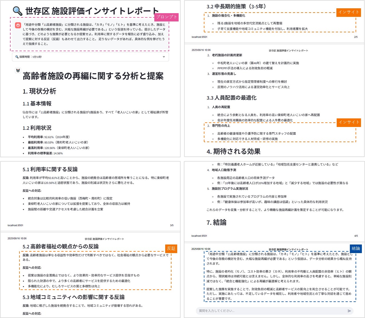 次のインサイトレポートの例では、「高齢者施設」をテーマに、大幅な施設再編が必要との仮説をもとにして、データに基づいた定量的な分析と必要な施策の提案、およびその提案に対する反証(反論)を含めて分析するよう生成AIに対しプロンプト指示を行っています。