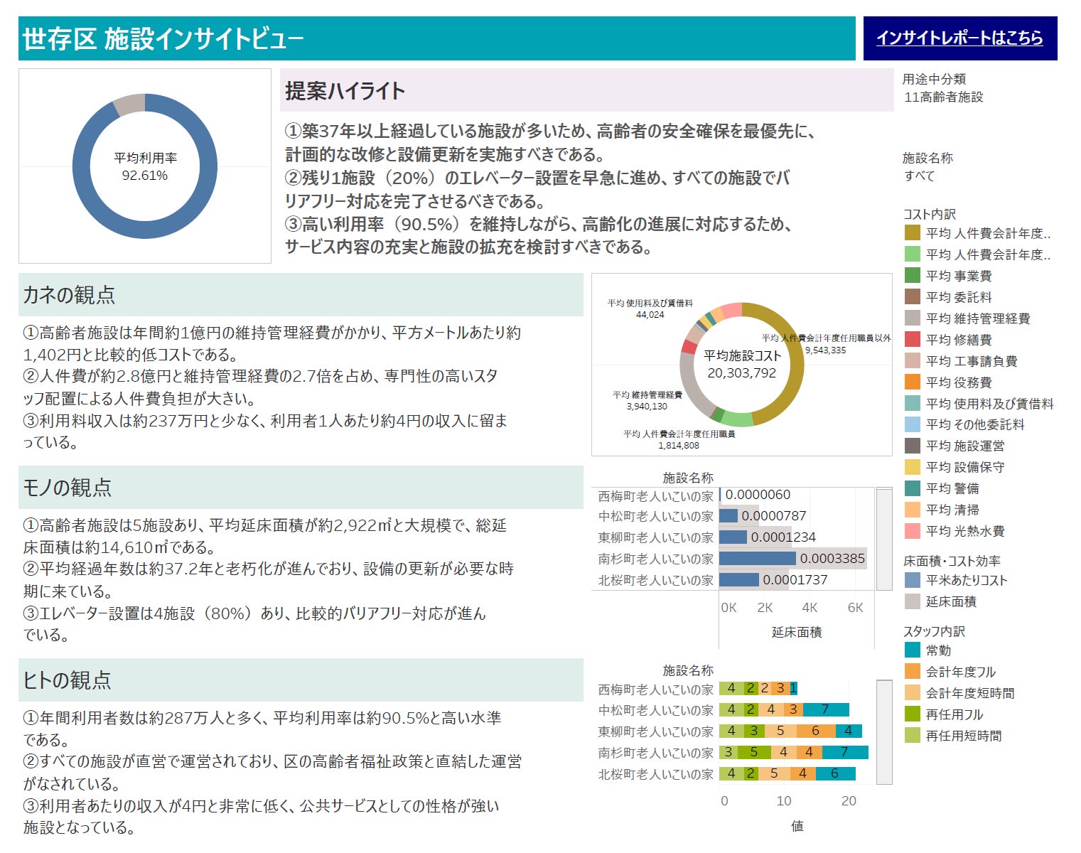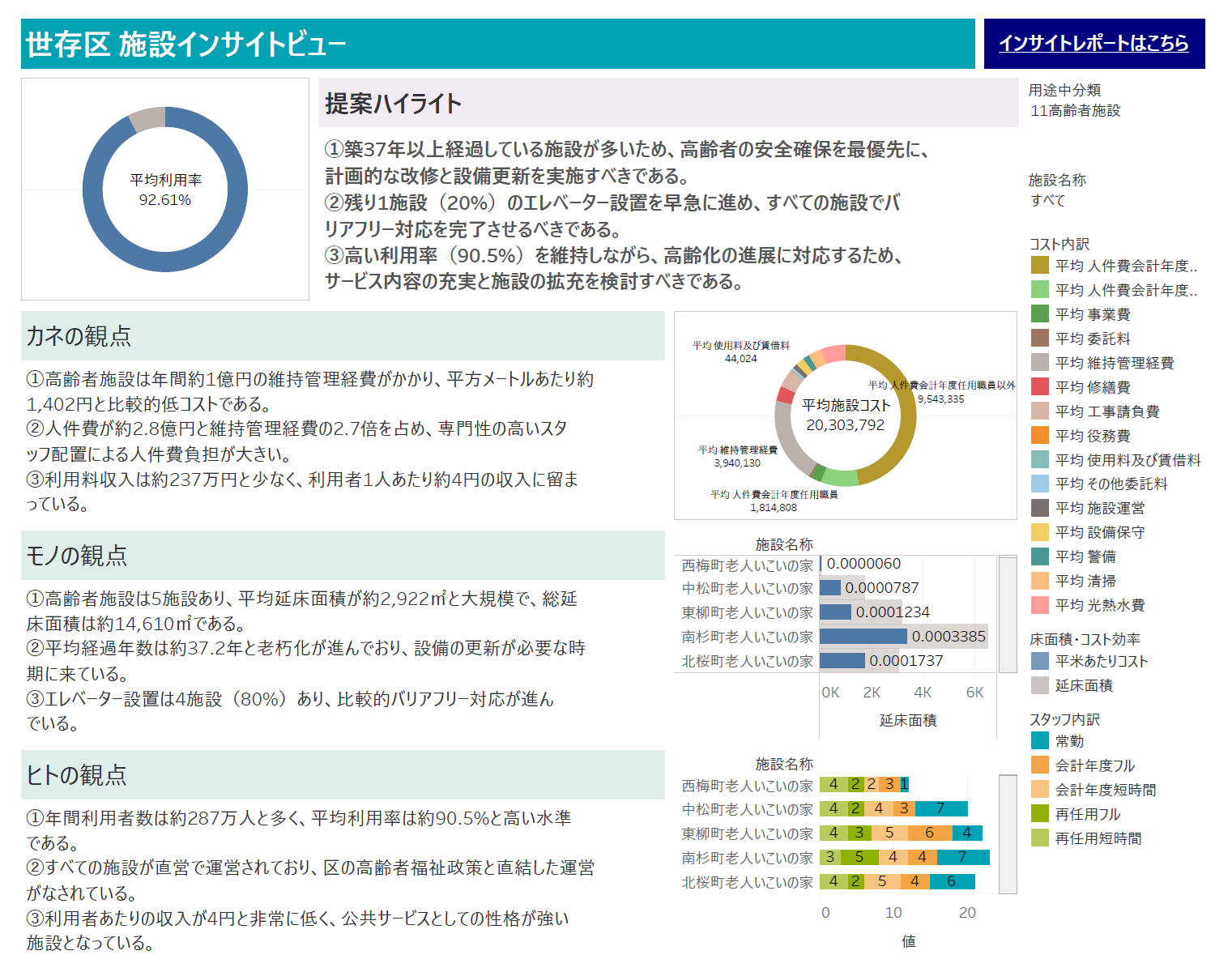 利用状況や施設の状態、また維持コストなどの定量分析のほか、「多世代交流拠点として再整備」「子育て支援機能や地域コミュニティ機能の付加」などの中長期的施策の提案や、「健康増進や介護予防に関する専門スタッフの配置」など人員配置に関するインサイト、提案の反論に対し「施設の全面廃止でなく効果的・効率的なサービス提供を目指すもの」「施設の多機能化によりサービスの質と多様性は向上」などの反証も得られています。
