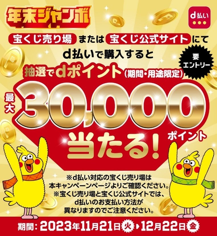「宝くじ売り場または宝くじ公式サイトのいずれかで、合計6,000円以上d払いで購入すると、抽選でdポイントが最大30,000ポイント当たるキャンペーン」を開催