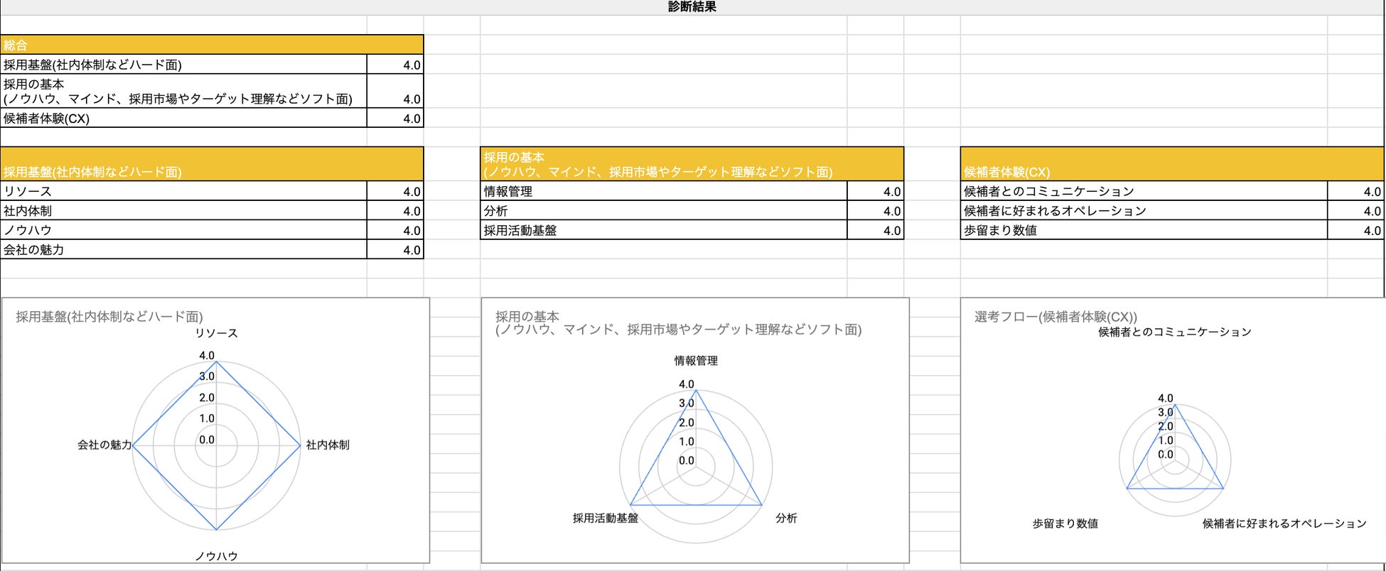 本シートを活用することで、採用に関する複数の項目について自社の状況をチェックし、数値を入力するだけで課題を可視化できます。