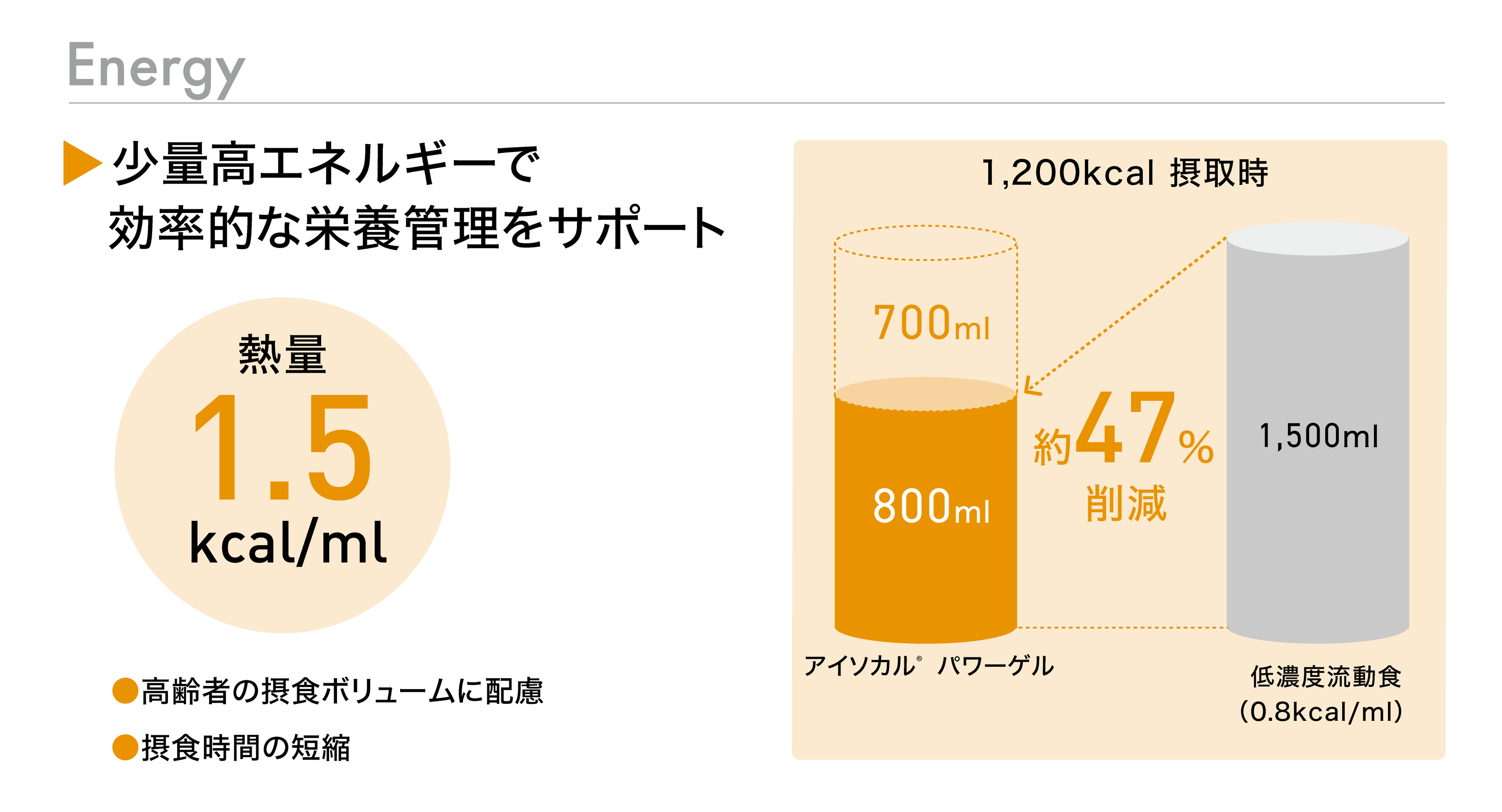 また、少量でも高エネルギーを摂取しやすく、日々の効率的な栄養管理をサポートします。