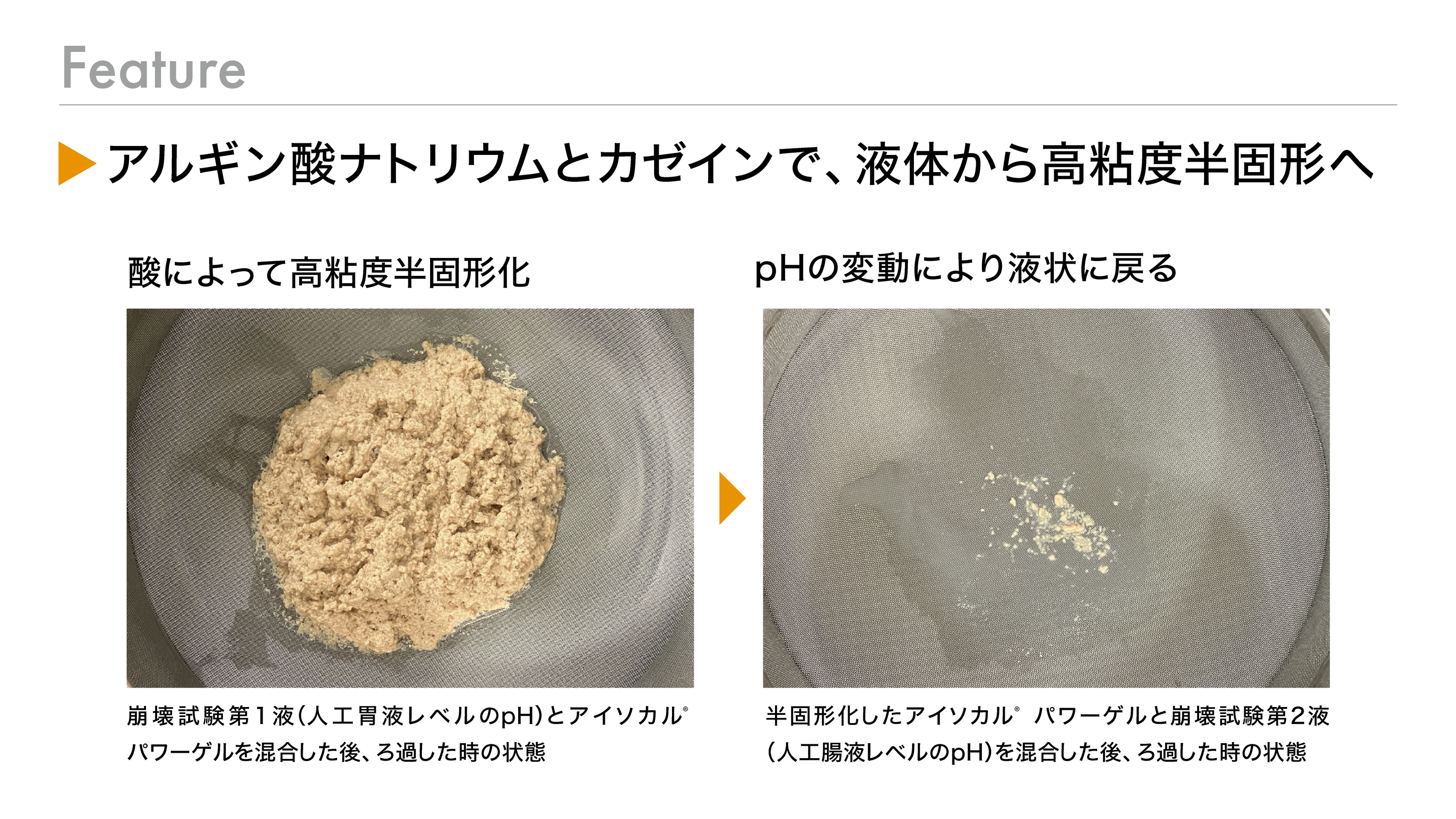 アルギン酸ナトリウムとカゼインにより、液体から高粘度半固形状へ変化