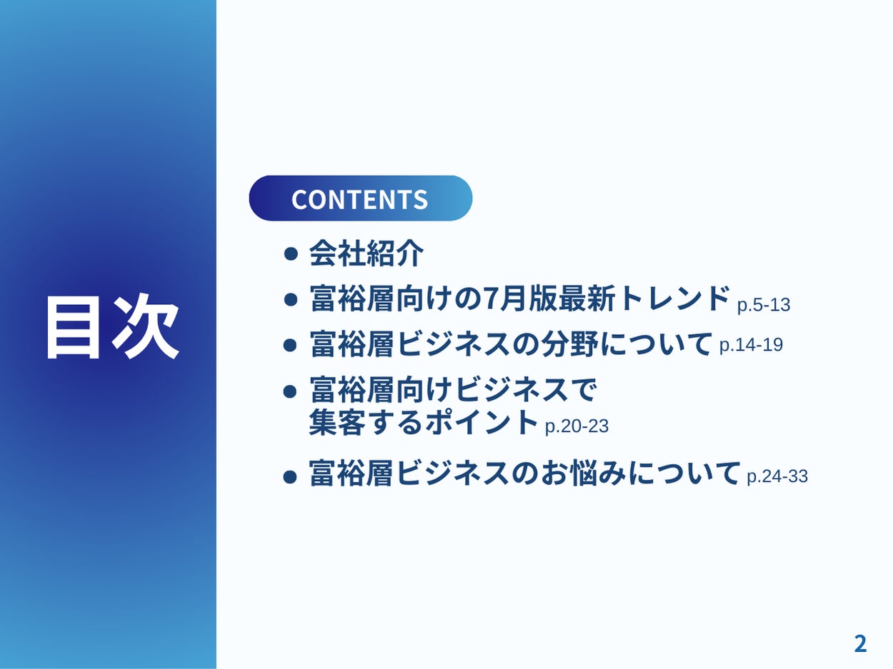 本レポートでは、富裕層マーケティングの理解と購買プロセスにおけるキーとなる要因を解説し、最適なアプローチ手法をご紹介します。本レポートを通じて富裕層の集客に効果的なマーケティング手法や事例を抑え、事業運営の際にご活用ください。
