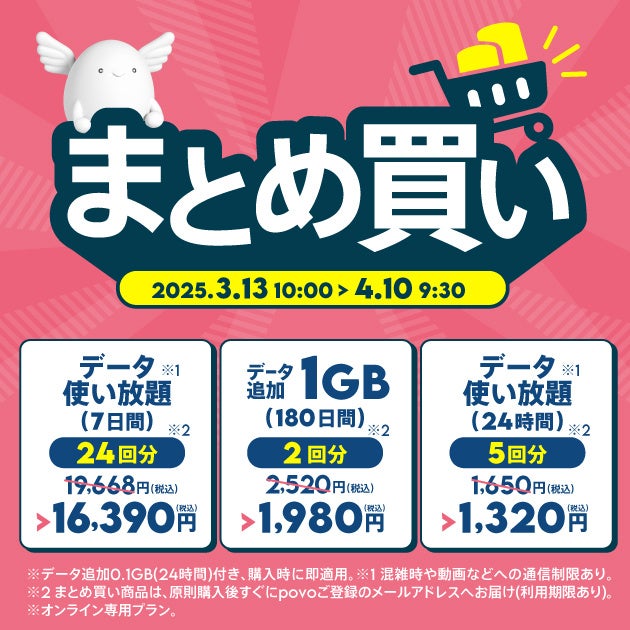 povo、まとめ買いにおすすめの180日間データトッピングやデータ使い放題トッピングを期間限定で提供