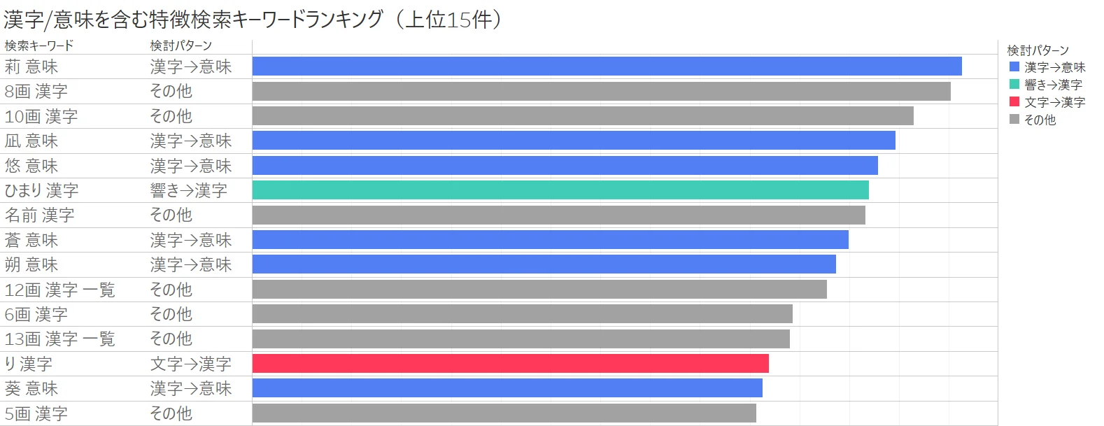 これらの人々が検索するキーワードをより深掘りして調べてみた結果、「漢字」「意味」と付くキーワードによる検索行動から検討の様子が具体的に見えたため、これらを含むキーワードに絞って調査しました。