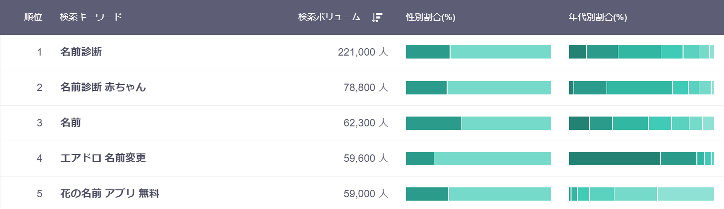 さらに、「名前診断」を検索する際に最もよく結びつけられる検索キーワードを見てみると、「姓名判断」「名前診断」「姓名判断無料」「姓名判断赤ちゃん」「画数姓名判断」が多く検索されていることがわかりました。