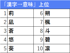 1位から順に、「莉」「凪」「蒼」「悠」「葵」「朔」「楓」「斗」「碧」「凛」となりました。