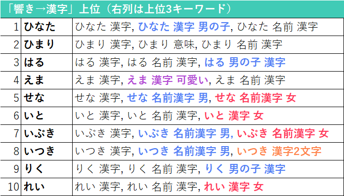 上位3キーワードを見ると、男女ともに使われる名前の場合は、性別が男性もしくは女性とわかる漢字にしたいという意図が垣間見えます。