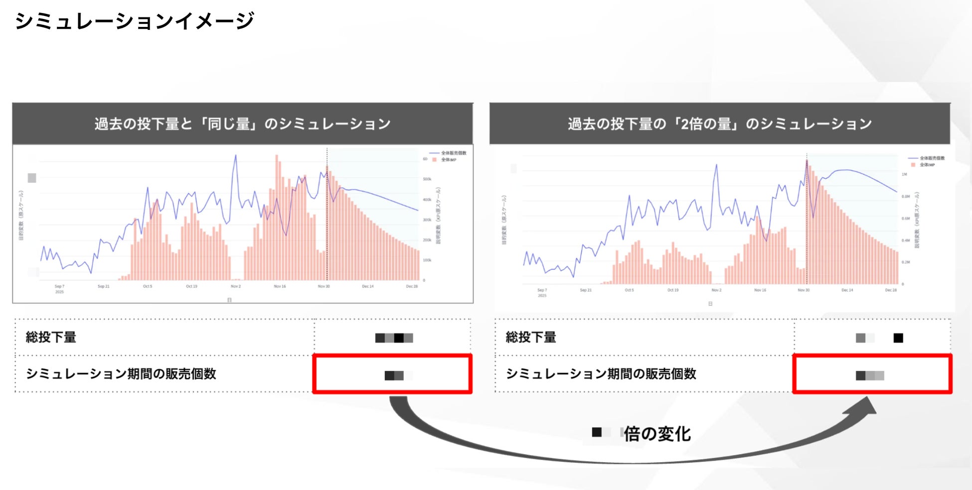 ・分析結果:「予算倍増時の売上予測」や「目標達成に必要な最適予算」を算出。